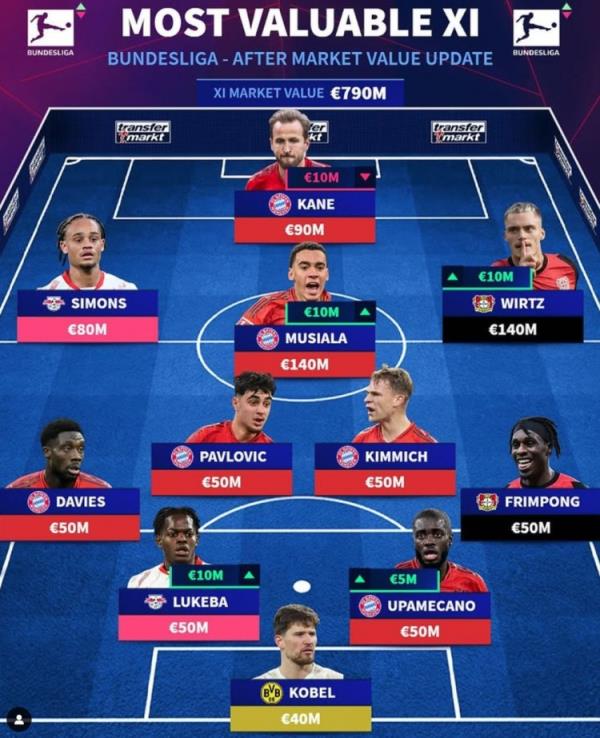 12月20日訊 《轉(zhuǎn)會市場》今日更新了德甲球員身價(jià),并列出了一套德甲最貴陣,拜仁6將在列,萊比錫、藥廠各2人。